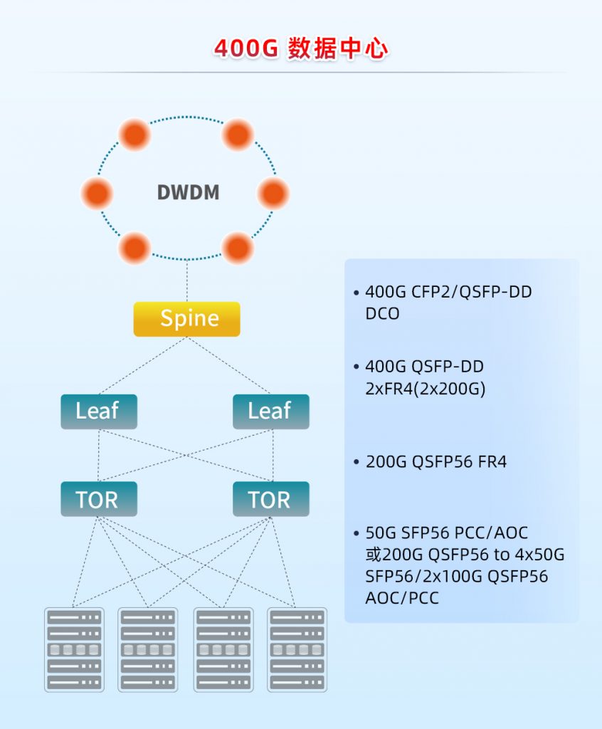 新推出的400G QSFP-DD 2×FR4与以往的400G QSFP-DD FR4的主要不同点在于:400G 2×FR4光口支持8×50G PAM4,而400G FR4光口为4×100G PAM4;同时,400G QSFP-DD 2×FR4还具备组网优势,它采用2×Dual LC光接口,支持扇出两个200G QSFP56光模块,可完成200G数据中心朝向400G数据中心的直接跃迁。其组网架构如下: