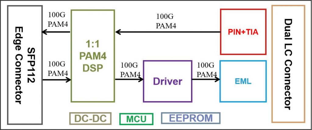 - 气密性封装,集成100G PAM4 1310nm EML与PIN接收器