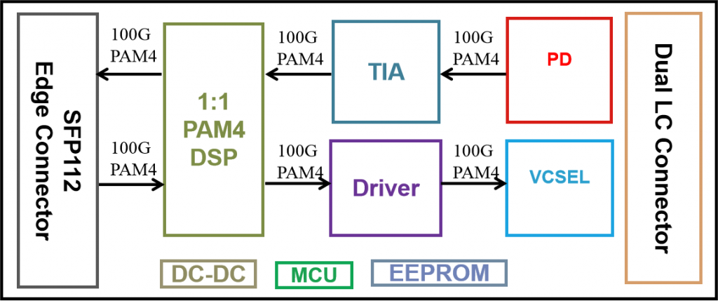 - COB封装,集成100G PAM4 850nm VCSEL与PIN接收器