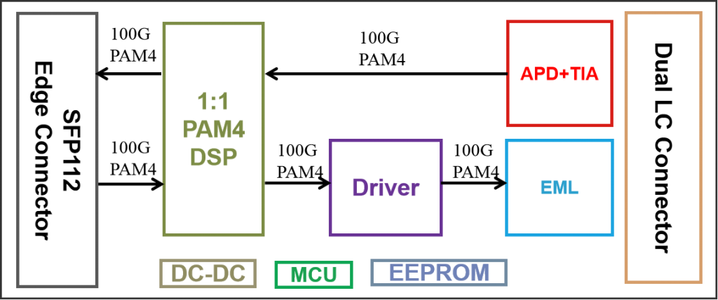 - 气密性封装,集成100G PAM4 1310nm EML与APD接收器