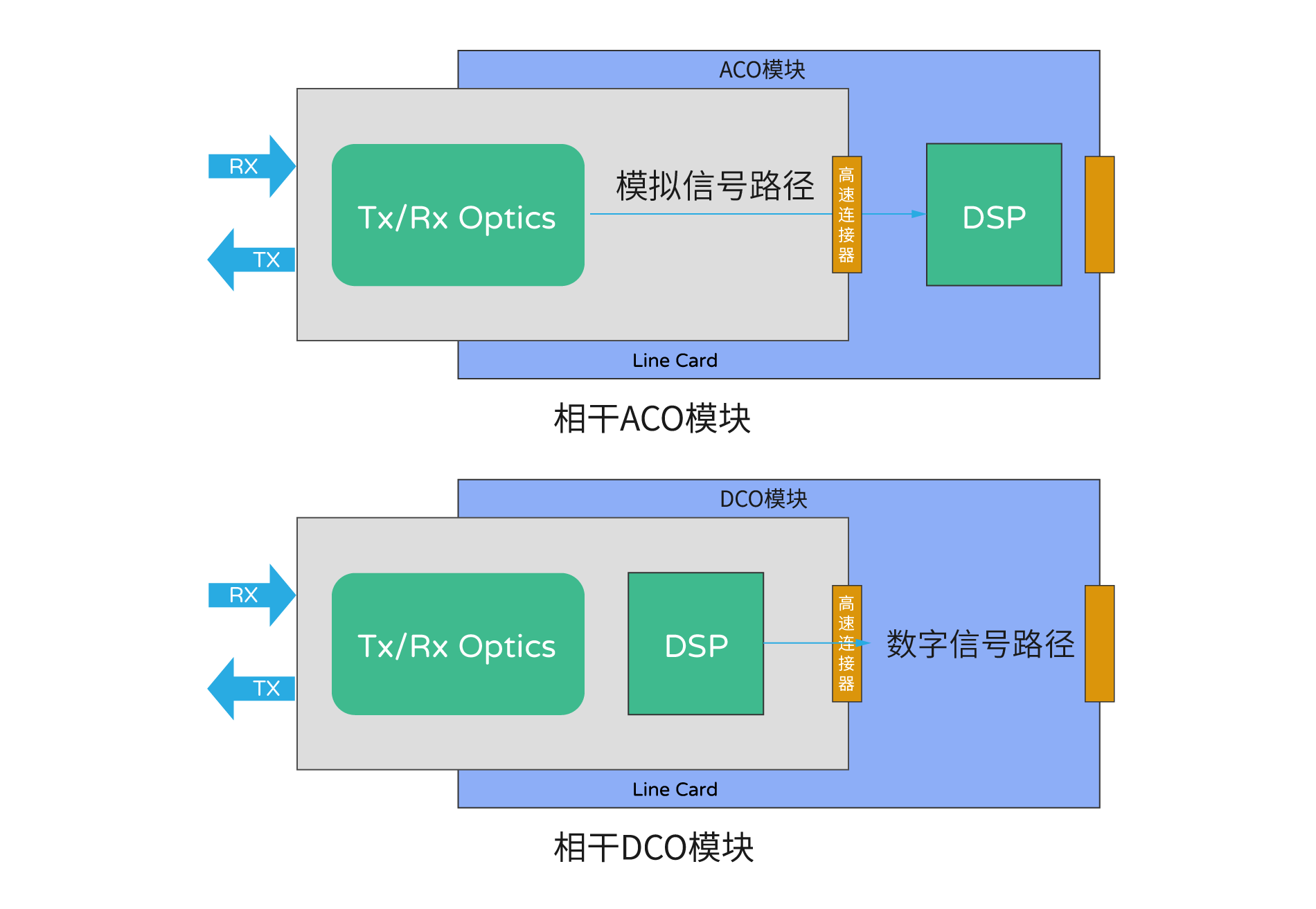 DCO模块与ACO模块最核心的区别在于,DCO将DSP芯片直接集成在光器件上,与系统之间采用数字通信方式,解决了跨厂商交换机互通的问题。另外因为DCO的集成度更高,相比ACO模块,DCO的功耗更低。
