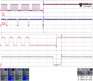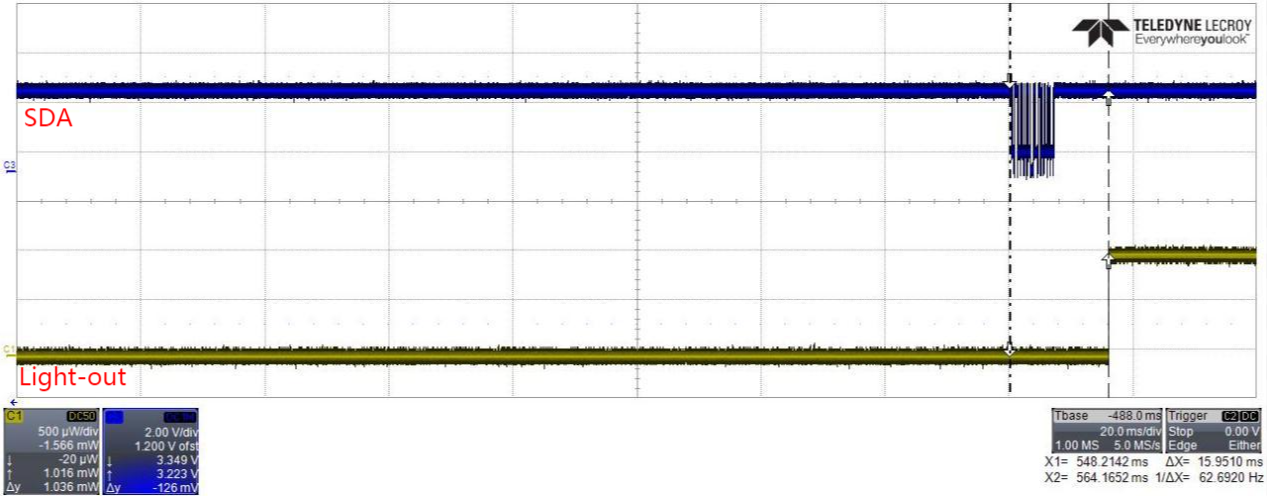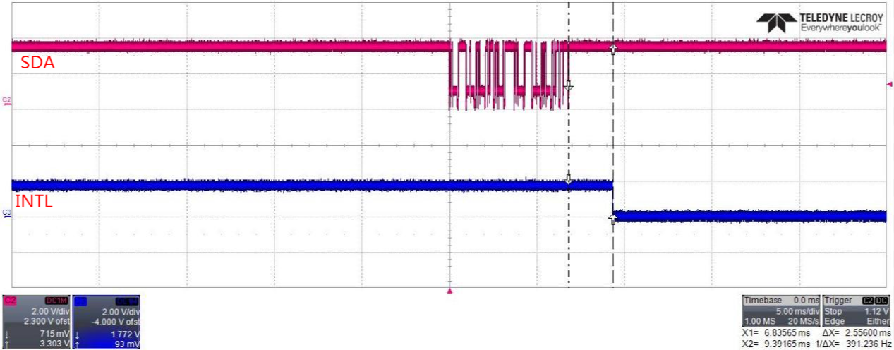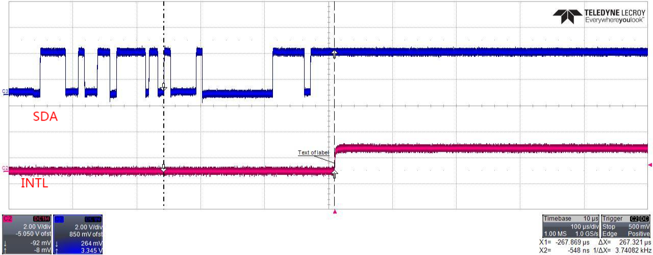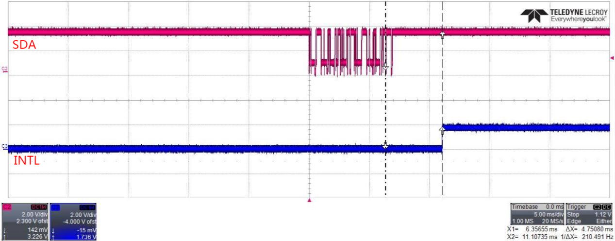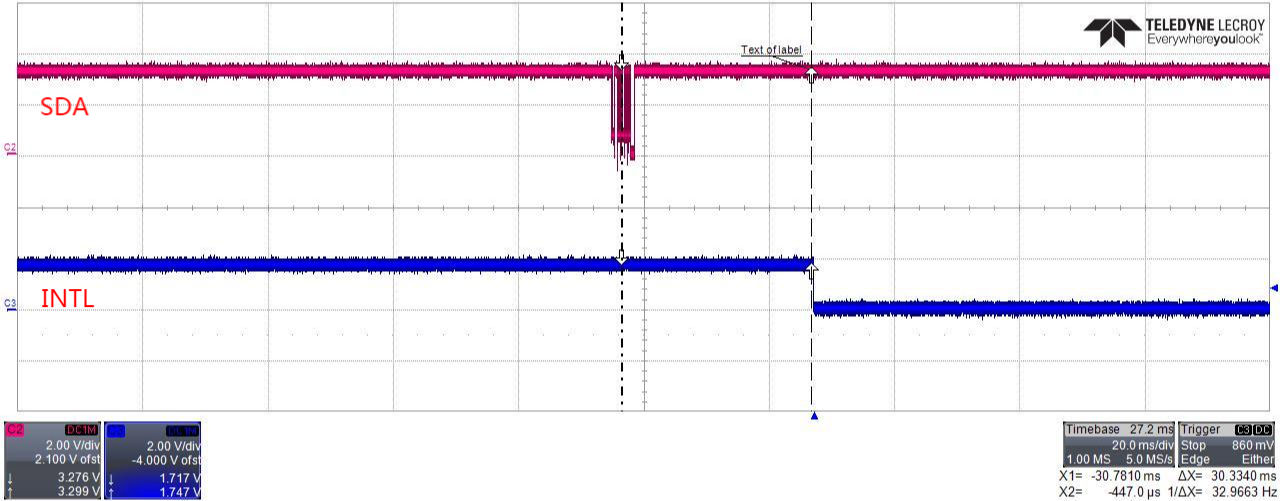 测试方法:光模块插入测试板中,使用示波器两个探头,一个接测试板上的SDA脚,一个点击测试板上的INTL点,通过GUI页面点击相应标志的mask(去掉勾选此功能)触发; 测试结果: