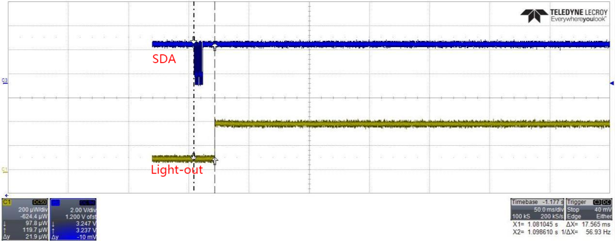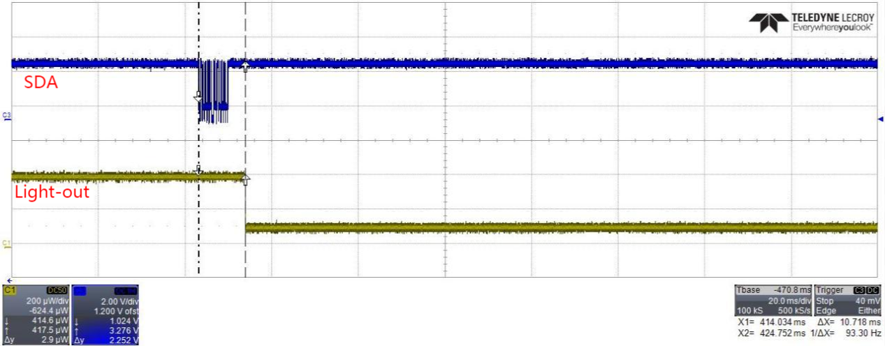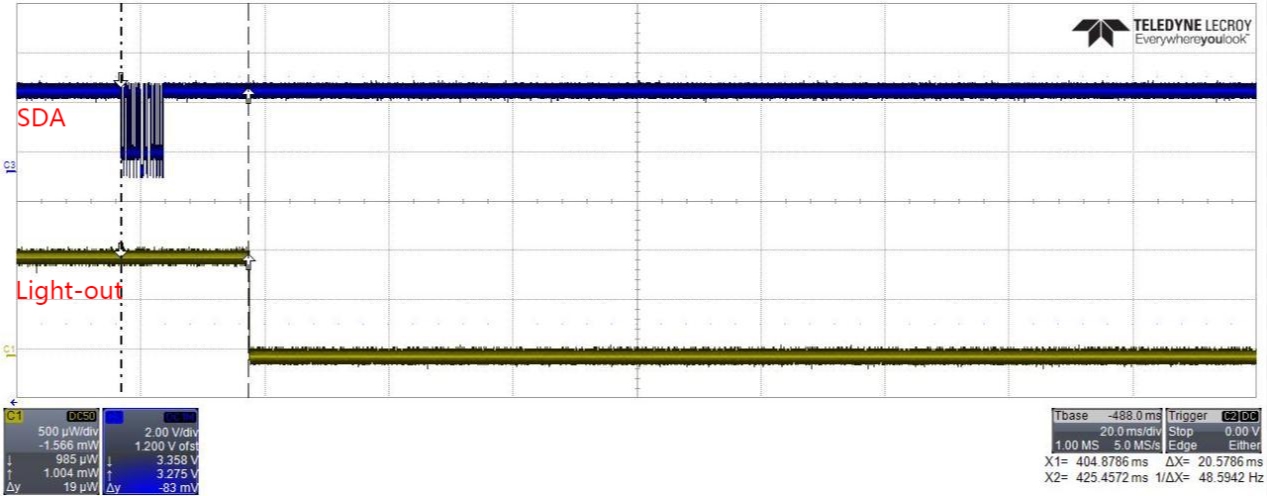 测试方法:将光模块插入测试板中,使用分光器,将需要测试通道的发射端接入分光器的OUT(light_out),使用示波器两个探头,一个接测试板上的SDA脚,一个连接分光器,点击GUI中的Ctrl页的TX Disable功能对应的测试通道(去掉勾选此功能)进行触发。 测试结果: