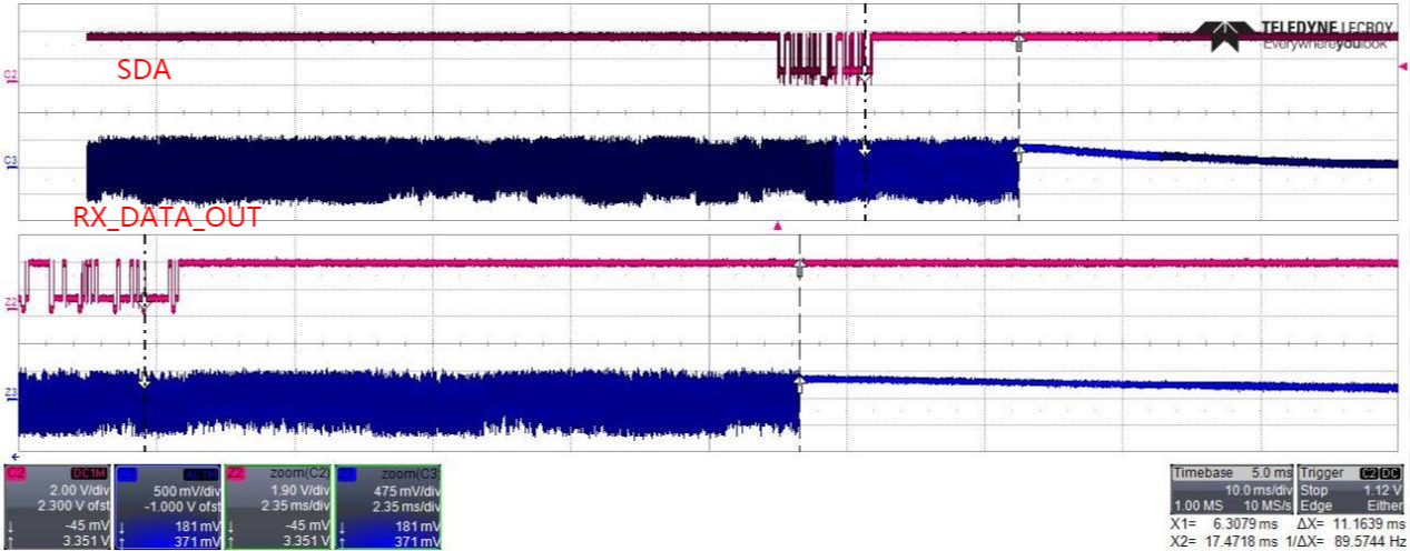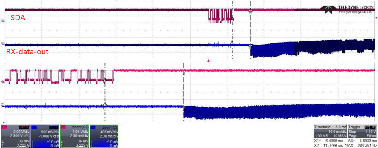 测试方法:将光模块插入测试板中,使用分光器,将需要测试通道的发射端接入分光器的OUT,使用示波器两个探头,一个接测试板上的SDA脚,一个连接测试板上RX信号的中心点上(RX_DATA_OUT),点击GUI中的Ctrl页的RX Output Disable功能对应的测试通道(去掉勾选此功能)进行触发。 测试结果: