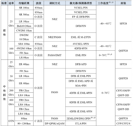 5G初期接入段可采用10Gbit/s或者25Gbit/s速率的光模块,比如采用VCSEL激光器的25G SFP28 SR 100m光模块或采用DFB激光器的25G eCPRI SFP28 LR 10km光模块等。随着速率的增长,50Gb/s PAM4光模块会快速起量,比如50G SFP56 FR PAM4 2km和50G SFP56 LR PAM4 10km光模块,主要应用预计会在中国移动的SPN网络中。