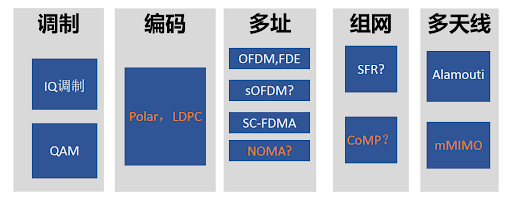 5G物理层的核心技术集中在无线通信和有线通信。万物互联是5G的终极实现目标,用户和基站之间的无线通信主要体现在空中接口技术,其主要包括调制、编码、多址、组网和多天线等技术。