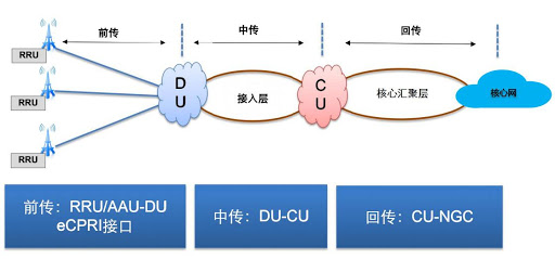 而有线通信的核心物理层技术主要体现在5G承载网的设计上。由下图所示,5G承载网主要由前传(Fronthaul:AAU-DU)、中传(Middlehaul:DU-CU)、回传(Backhaul:CU-核心网)三部分组成。