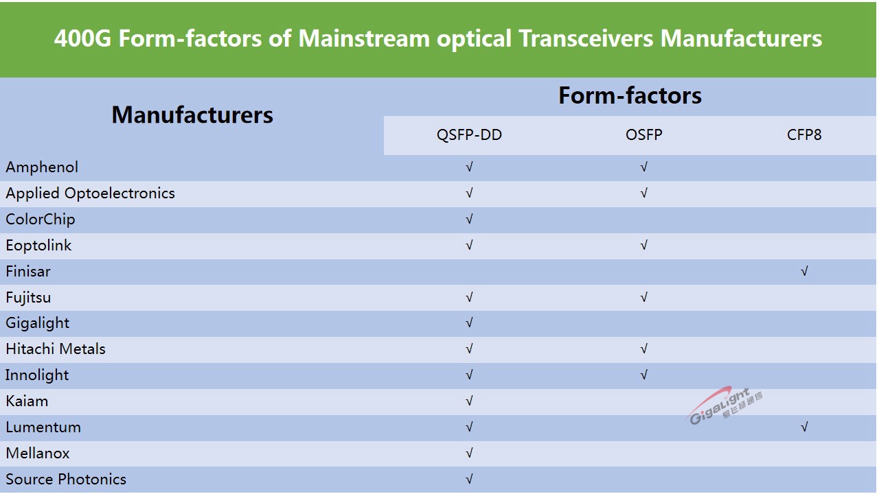 时间进入2019年,400G成为了光通信行业的热门话题,全球领先的几大光模块厂商都推出了各自的400G光模块。当把这些厂商的400G光模块封装罗列出来后(如下图所示),我们发现除了被收购的Finisar以外,其他厂商都采用了QSFP-DD封装——市场似乎已经认可了QSFP-DD作为400G光模块封装的首选。有个别厂商还额外推出了OSFP封装和CFP8封装的400G光模块。
