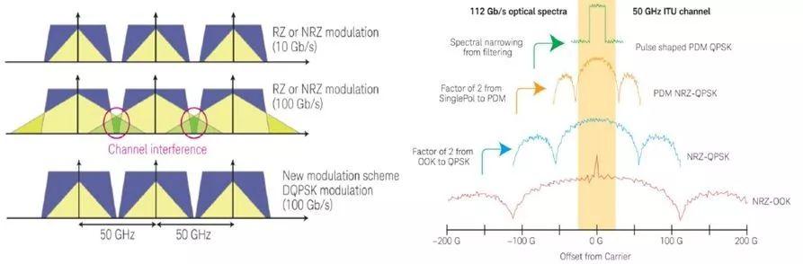 提高频谱利用率的一种有效方法是减少WDM中相邻信道之间的频率间隔——这要求缩小光信号的频谱,奈奎斯特滤波对此至关重要,因为它使得发射机处的DSP能够缩小光信号频谱同时最大限度地提升了信号质量。目前商用系统最新标准中的频率间隔是50GHz,若要减小到25GHz、12.5GHz,就需要传输信号通过带宽更窄的光复用器和解复用器,由此带来的相邻信道干扰,对系统性能有很大影响。