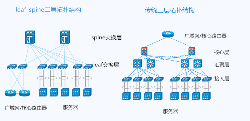 leaf-spine拓扑网络结构主要为解决数据中心内流量的快速增长和数据中心规模的不断扩大,满足传统的三层网络拓扑结构不能满足的数据中心内部高速互连的需求。