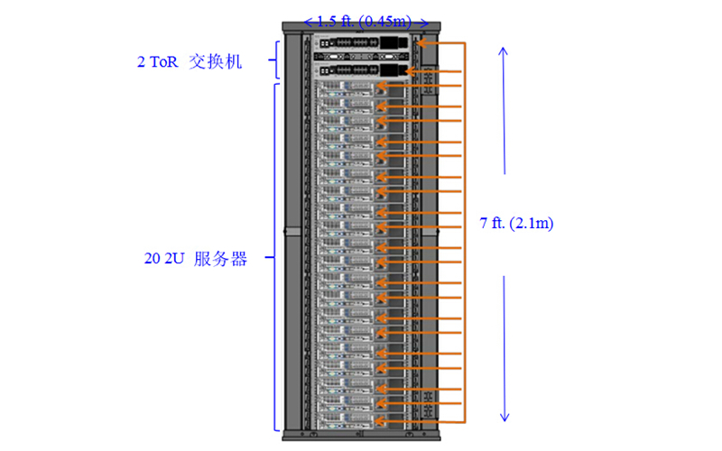 当您要在一个84英寸、45RU的机柜内部署SFP+ DAC高速线缆时,保守估计从机柜顶部到底部的线缆长度约为7英尺(2.1m),上下两个相邻端口间的线缆长度约为1.5英尺(0.45m)。如果一个机柜上有2个架顶式(ToR)交换机、20个2U SFP+网卡的服务器,那么需要的SFP+ DAC高速线缆最长应为2.1+2×0.45≈3m。此时,您购买3m的SFP+ DAC高速线缆即可。