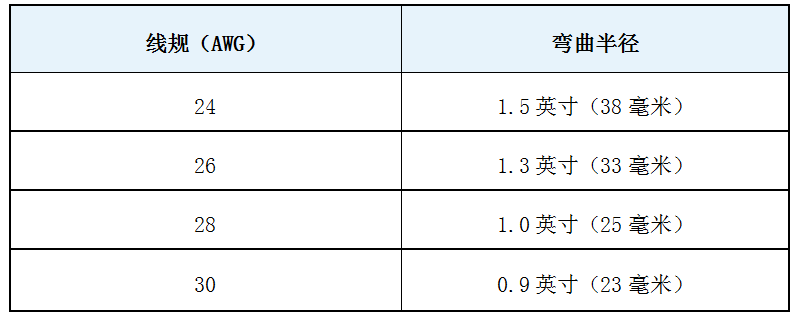 当部署SFP+ DAC高速线缆时,请确保线缆在最小弯曲半径标准内,根据美国线规,不同的SFP+ DAC高速线缆都有不同的最小弯曲半径。下表展示了不同线规的SFP+ DAC高速线缆的最小持续弯曲半径。