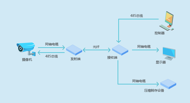 SDI光端机可支持摄像机和监控室之间的双向通信。SDI光端机工作原理是将模拟视频信号进行A/D变换后和语音、音频、数据等信号进行复接,再通过光纤传输,其实简单点说就是监控设备(摄像机)采集的高清视频信号通过光端机发射端发送到监控室的光端机接收端,信号经过视频环出电路后转换成两路完全一致的信号并输出,输出端既可以连接显示器,也可以连接压缩转存设备,实现视频的分配;同时,监控室的控制器可以通过光端机向摄像机发送RS485控制信号来反向控制摄像机。