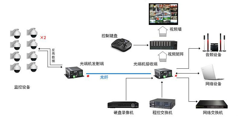 由于光纤传输优势较大现已被广泛部署起来,与此同时SDI光端机的应用场合也变得更加广泛。目前SDI光端机一般应用于长距离视频和数据的传输,如在高速公路、银行、电力、电信等监控领域都要求对视频信号进行远程的传输,因此在监控领域需要利用SDI光端机将视频信号转化为数字信号通过光纤进行传输;同时SDI光端机在远程视频会议、远程教学、远程医疗、通讯等领域也有广阔的应用前景。那么SDI光端机在监控领域中该如何使用呢?与SDI光模块该如何搭配?具体方案如下: