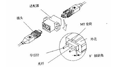 MPO(multifiber push-on)光纤连接器是一种多芯多通道的可插拔连接器,它是IEC标准(IEC 61754-7)的MPO光纤连接器的一种结构。MPO连接器分为公母接头,由一对MT套筒、两支导引针、两个外壳和一只适配器组成。公端的接头有两个引导脚和数个光纤孔,光纤孔的数量最多可至72个,但最常见的是12个孔的。在对接连接器时,装在插芯尾部的弹簧会对插芯提供一个推力,使其与适配器锁死。而插芯的引导脚则起限制接头之间的相对位置,保证光纤对接顺序无误。为了得到高的回波损耗而不用折射率匹配材料,光纤的端面和套筒都以8°的角抛光,而光纤的端面必须精密地抛光,使得与对面的光纤端面相接触。