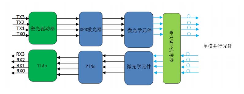 100G QSFP28 PSM4光模块符合100G PSM4标准,采用单模光纤并行传输的模式,每个100G模型采用8芯单模光纤共构成4个独立的通道,每通道传输25G数据。这种光模块使用12芯MPO/MTP接口,其中MPO/MTP接口的中间4芯光纤不启用。100G QSFP28 PSM4光模块的光纤传输方式与100GBASE-SR4光模块类似,不同的是前者使用单模光纤作为传输介质,而且采用激光光源1310窗口。100G QSFP28 PSM4光模块通常和OS2单模光纤一起使用,传输距离可以达到500m,与其他100G光模块相比,100GBASE-PSM4 QSFP28光模块在这个传输距离范围内的部署成本具有极大的竞争力。下图是100G QSFP28 PSM4光模块的工作原理图: