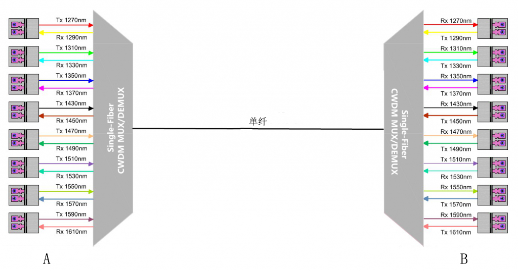下图是单纤双向CWDM复用/解复用器的工作原理图,图中一共使用了16种波长来实现8种光载波信号在一根光纤上的传输,其中,A端的发射光信号波长和B端的接收光信号波长一致,B端的发射光信号波长和A端的接收光信号波长一致。