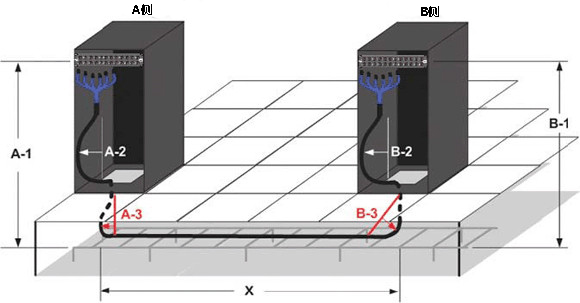 其中:“X”是指水平距离“A1”是指A侧垂直距离“A2”是指A侧机柜内线缆的实际长度“A3”是指A侧线缆从地板上到机柜底部的距离“B1”是指B侧垂直距离“B2”是指B侧机柜内线缆的实际长度“B3”是指B侧线缆从地板上到机柜底部的距离。