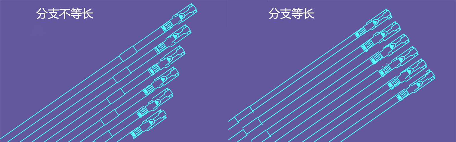 预端接主干铜缆两端的分支主要有两种结构类型,一种是分支等长的预端接主干铜缆,还有一种是分支不等长的预端接主干铜缆(如下图)。分支不等长的预端接主干铜缆的布线更整齐,但是在布线前应计算各个分支线缆的长度是否能满足布线需求。