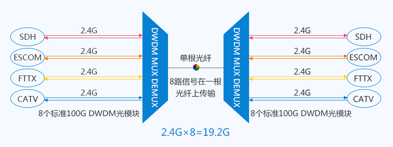 DWDM是一种用来在现有的光纤骨干网上提高带宽的激光技术,更确切地说,该技术是在一根指定的光纤中,多路复用单个光纤载波的紧密光谱间距,以达到用一根光纤传输多路信号的目的。这样,在给定的信息传输容量下,就可以减少所需要的光纤的总数量。DWDM复用/解复用器可以提供大容量、多样化的宽频服务,能让网路经营者在有效成本下将传输频宽提升至16、32、64甚至128倍。目前的DWDM复用/解复用器可提供16/20波或32/40波的单纤传输容量,最大可到160波,具有灵活的扩展能力。