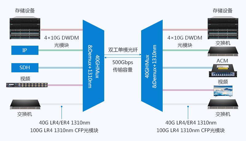 需要注意的是,与1310 nm端口连接的光模块的工作波长必须是1310 nm,例如40G LR4 1310nm QSFP光模块、40G ER4 1310nm QSFP光模块和100G LR4 1310nm CFP2光模块等。现在回到上一段提到的问题:如何用40通道的DWDM复用/解复用器实现500Gbps的传输速率?上文已经提到,40通道的DWDM复用/解复用器可以通过一对光纤实现400Gbps的传输速率,剩下的100Gbps我们可以通过1310 nm端口来实现,只需要用光纤跳线将1310 nm端口与终端设备(以太网交换机、路由器等)上的100G LR4 1310nm CFP2光模块连接在一起,整个DWDM系统就能实现500Gbps的传输速率。具体实例如下图: