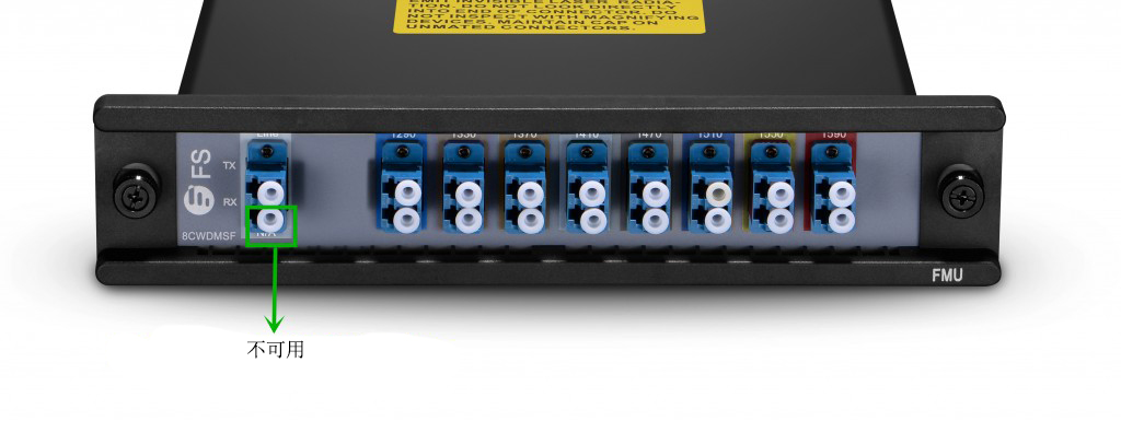 单纤双向波分复用器只使用一根光纤进行光信号的发射和接收,因此光纤上的发射光信号和接收光信号必须采用不同的波长进行传输。在光纤网络中使用单纤双向波分复用器时,应注意一端的发射光信号波长应和另一端的接收光信号波长一致,反之亦然。此外,现在市场上的一些单纤双向波分复用器仍采用双工线路端口,但是只有一个接口在工作,例如下图中FMU单纤CWDM波分复用器,尽管配置的是双工线路端口,但实际上只有一个接口在工作,另一个端口下面则标注的是“不可用”。