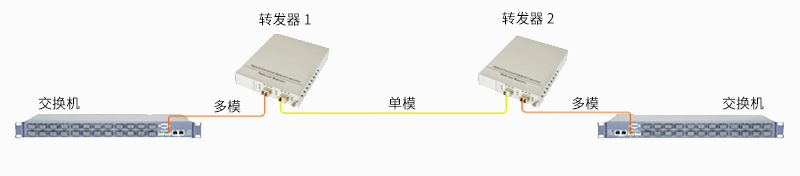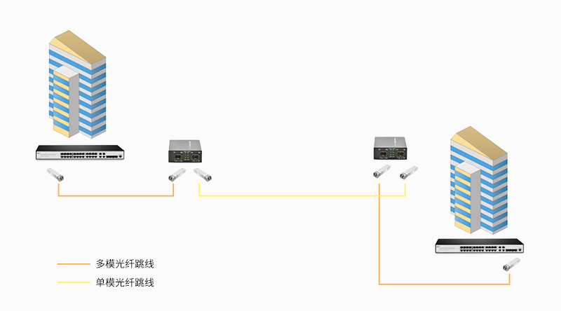 在延长光纤网络传输距离的实际应用中,光纤收发器通过将多模光纤转换为单模光纤实现了两台以太网交换机之间的远距离连接,如下图所示: