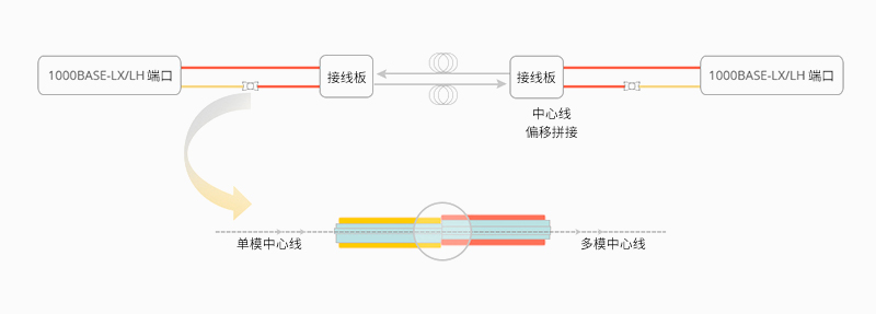 与上述两种方法相比,模式调节光纤跳线在多模光纤和单模光纤的转换上有所不同。模式调节光纤跳线不能像WDM转发器一样改变光纤类型来延长网络传输距离,它是通过改变光的传输模式以实现多模光纤到单模光纤的转换。模式调节跳线的光纤连接头可以以一种特殊的位移将单模激光发射到多模光纤中心,致使单模激光可以在多模光纤纤芯直径内传播,从而屏蔽当光在多模光纤中以多种模式传播时产生的差值模式延迟(DMD)效应带来的影响。此外,模式调节光纤跳线只适用于千兆1000BASE-LX(或10G以太网 10GBASE-LRM和10GBASE-LX4 )设备的应用。