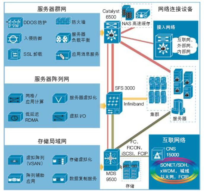 以下图的Cisco数据中心网络架构为例,我们可以看到数据中心内部主要分为服务器群、服务器阵列、存储局域网、互连网络以及接入网几个部分。