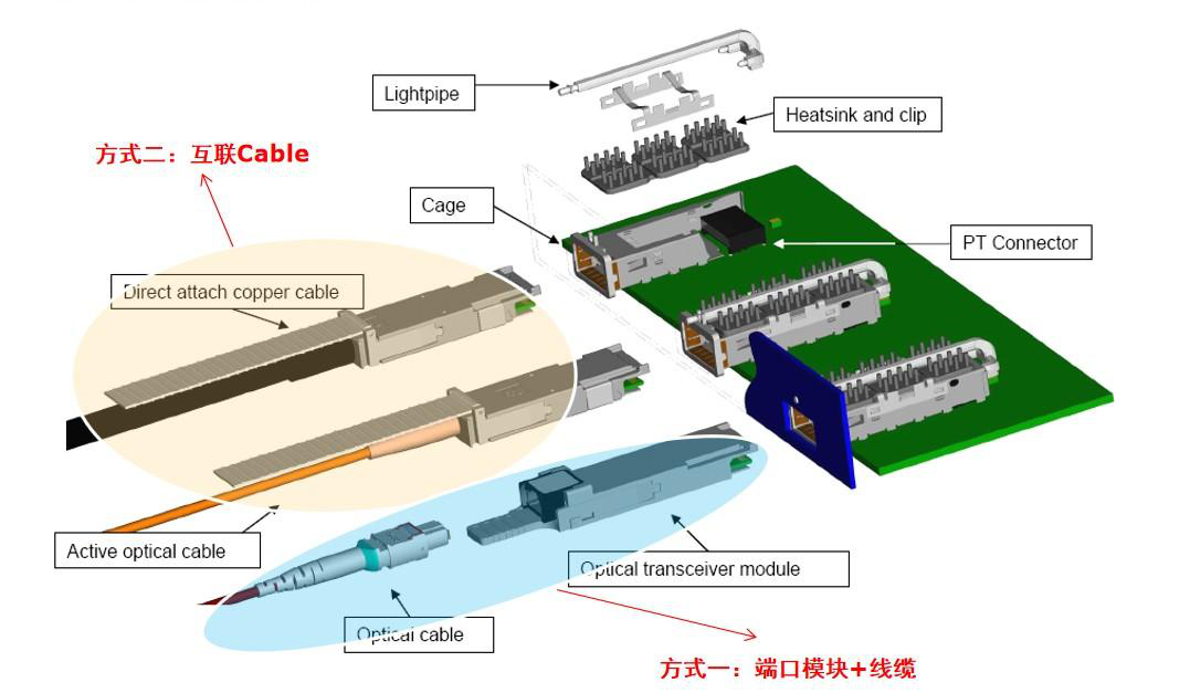 | 方式一:端口模块+线缆 | 方式二:互连Cable | |