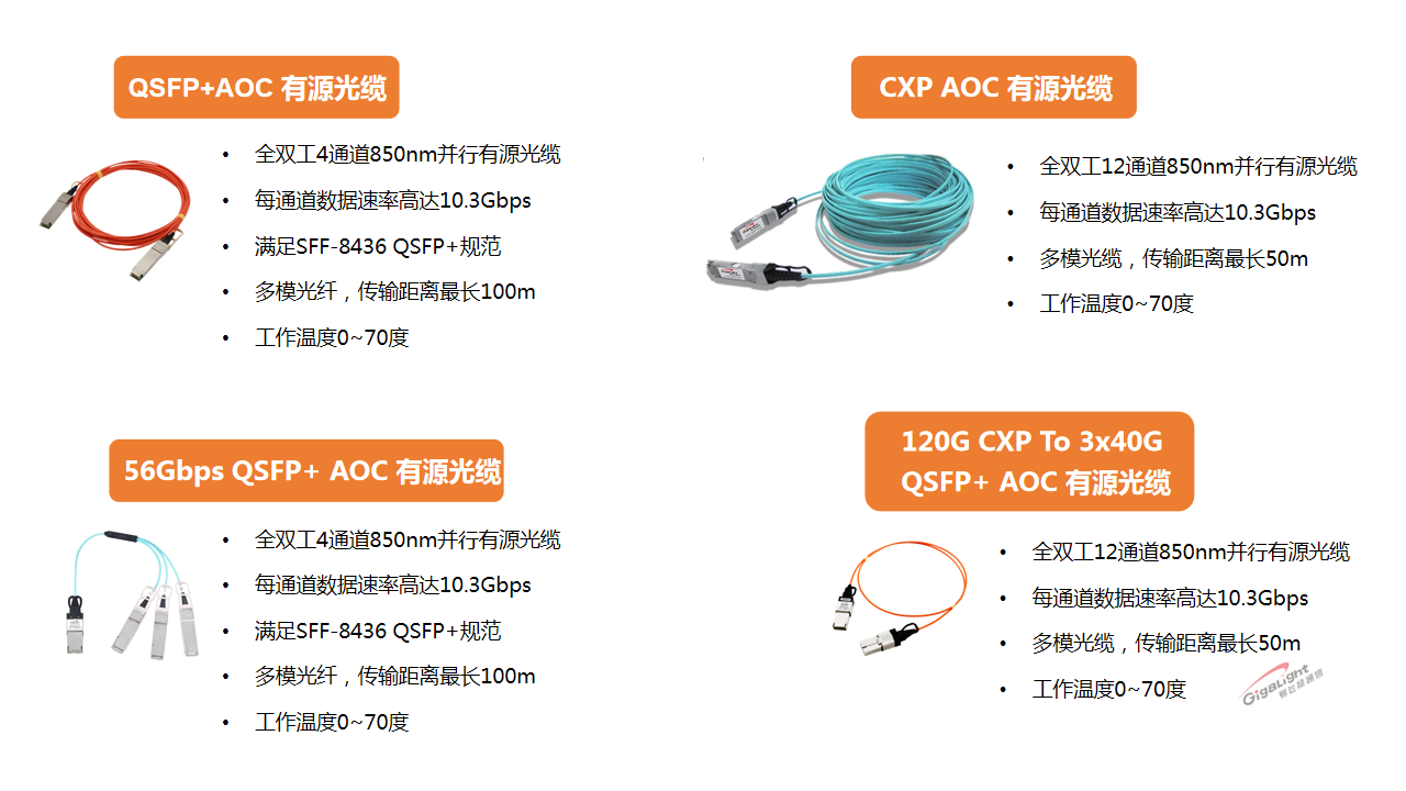 这对于短距离传输的有源光缆AOC产品来说是一个重大的利好;但由于部署场景的不同,对于工业级的温度、功耗等都为光器件企业提出新的要求。不管是现在的100G场景还是未来的400G应用,易飞扬(Gigalight)将时刻走在行业前沿,为市场提供满意的产品和方案。