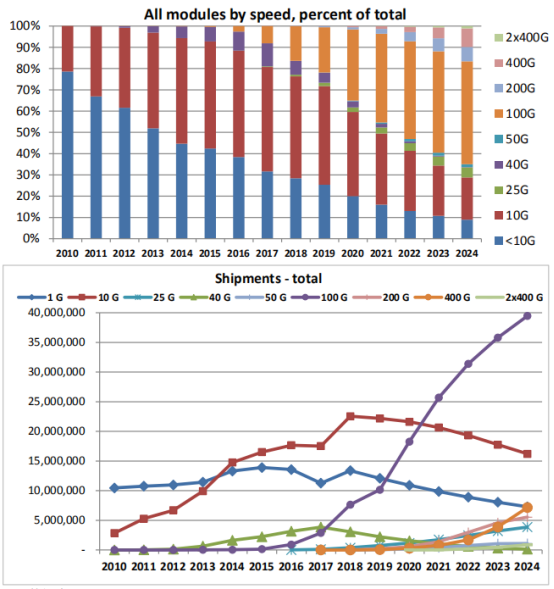 4、10G及以下低速率的光模块仍然是当前市场上最主流的产品。