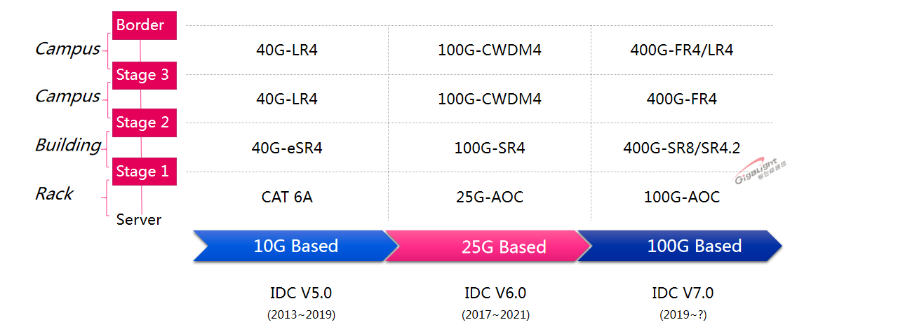 下图来自腾讯的演讲PPT,目前以腾讯为代表的国内大型互联网数据中心才刚开始向100G光学器件过渡。