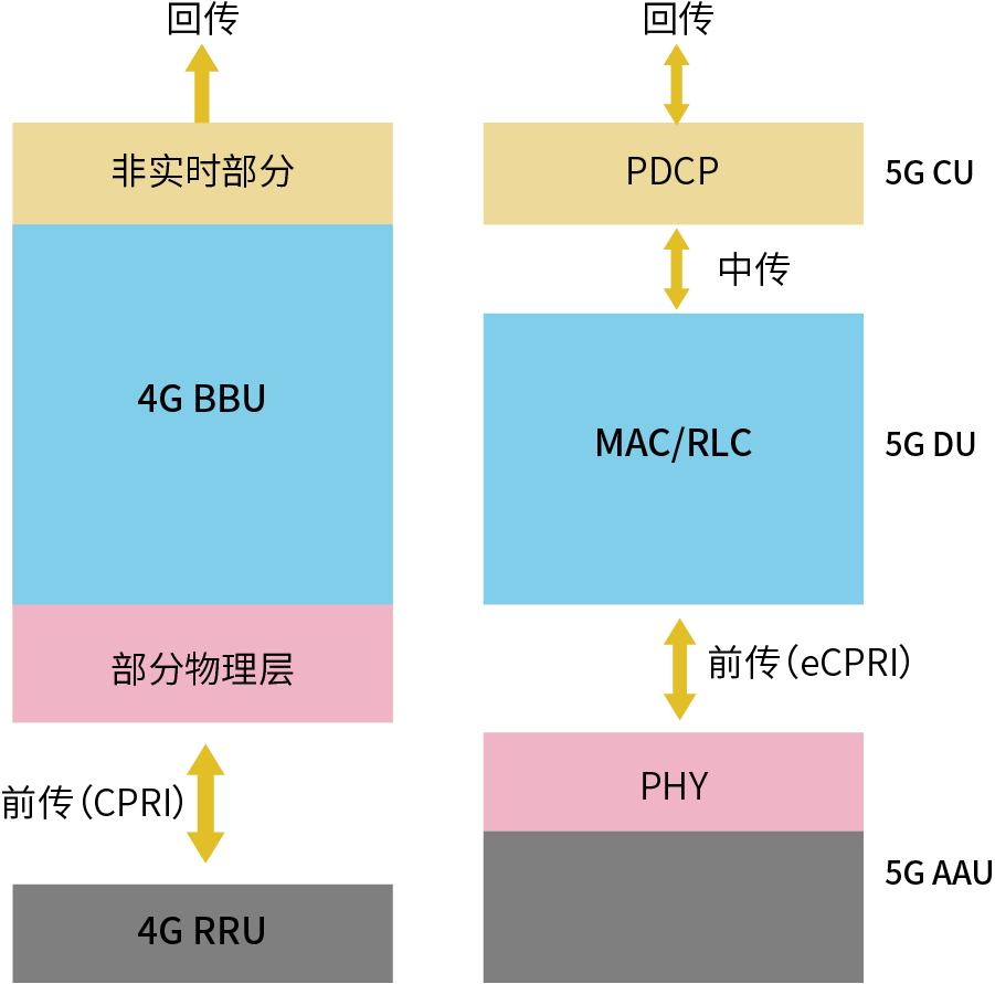 5G将4G基带单元(BBU),无线电远程单元(RRU)和天线重构为集中式单元(CU),分布式单元(DU)和有源天线单元(AAU),从而确定5G网络将包括前传,中传和回传。这些变化对光模块提出了新的要求,以满足与5G网络架构中与关键链路相关的高带宽和距离要求。