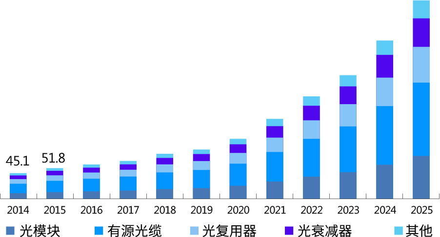 从2019年下半年开始,中国移动、中国电信、中国联通、韩国电信、SK Telecom、LG Uplus、Verizon、AT&T和T-Mobile领导了5G商业部署。这对光网络的需求提升到新的高度,并为光模块市场提供了巨大的机会。Research and Markets的一份报告预测,全球光模块市场规模预计将从2020年的57亿美元增长到2025年的92亿美元,从2020年到2025年的复合年增长率为10.0%。