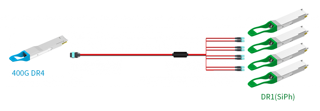 在400G架构中,对应400G QSFP-DD DR4的一分四应用,比如TOR Switch下连Server。