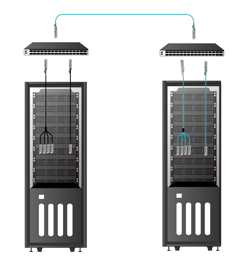 DAC和AOC最常规的应用是以太网数据通信,在明亮洁净舒适的机房内,温湿度都有较好的控制,高速线缆满足商业级0~70度即可使用。数据中心采用的TOR架构,接入层交换机放置在每台机柜上方,减少每台机柜与列头柜之间的布线,但是每台机柜服务器密度提高了,服务器与接入交换机的互连数量增加,距离缩短,延迟也大大缩小。在这种架构下,传输距离要求一般在30米内。用于以太网的DAC和AOC品类也最丰富,囊括了从10G到400G的各种速率。