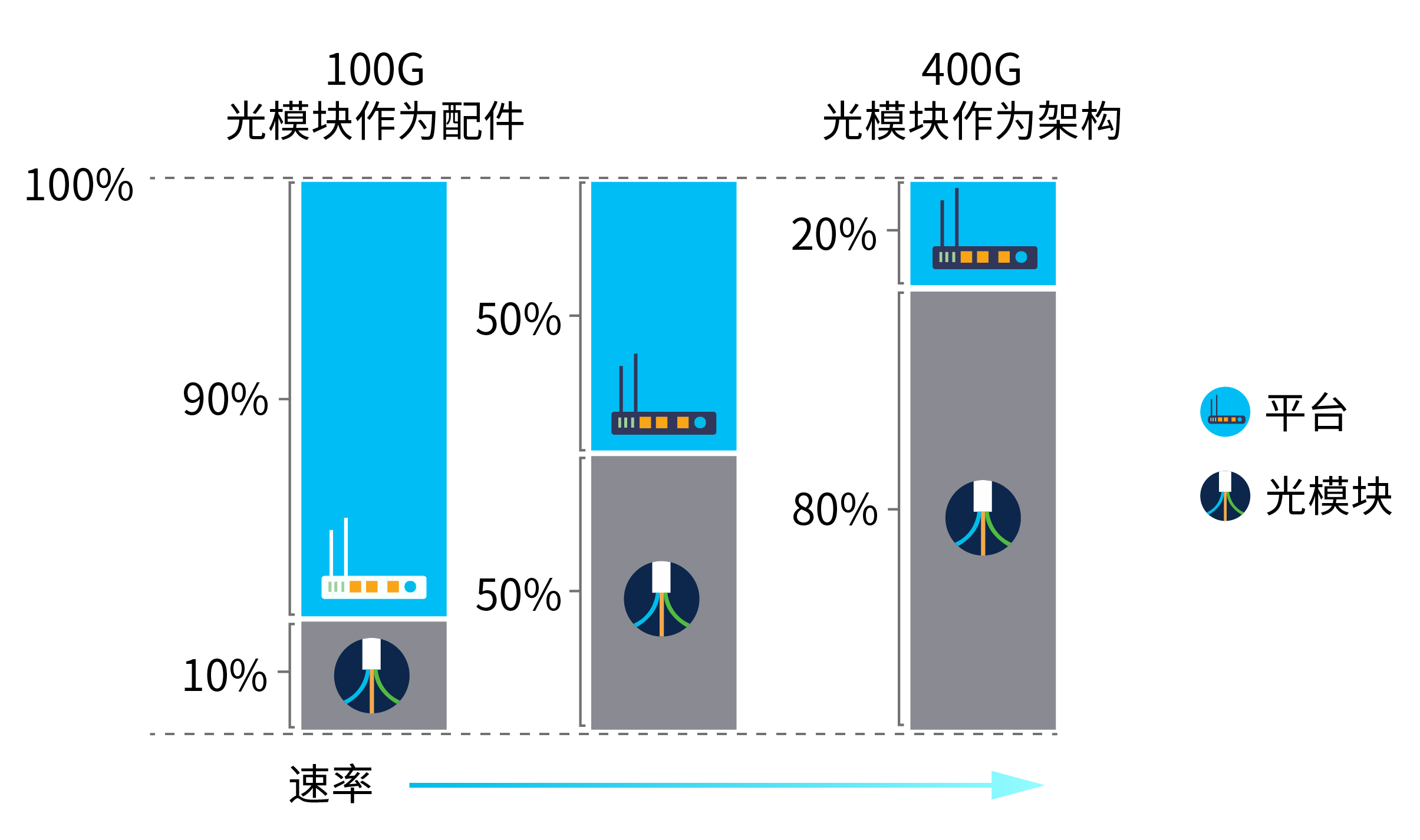 图1:在100G和400G数据速率下,光模块占系统总成本比例增加