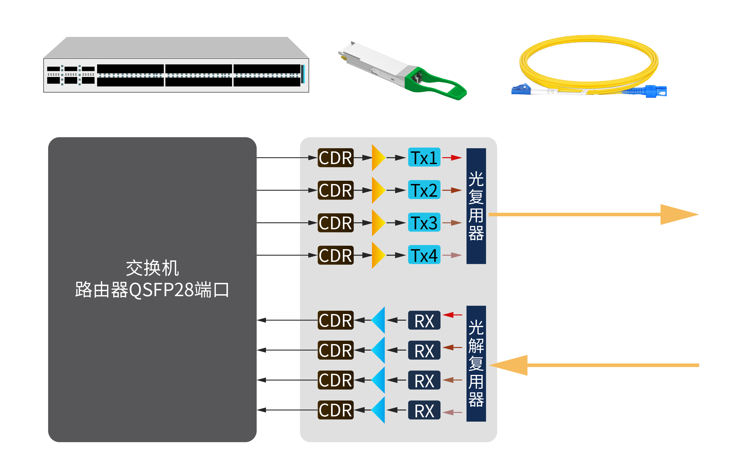 图4显示了SFP112模块的示意图。请注意,它看起来与图3几乎相同。两者都是单通道,只需要一个激光器和光接收器。SFP112可能需要CDR(时钟和数据恢复)电路。