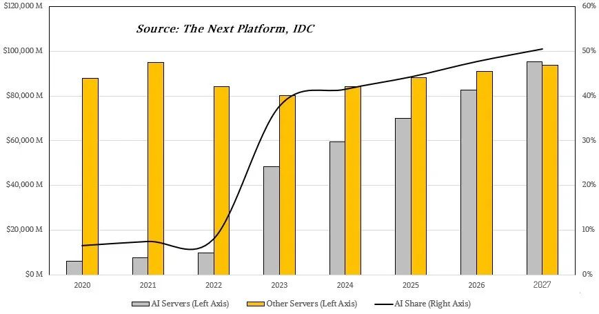 The next platform认为,除非有什么事情减缓了AI模型的增长,或者AI训练和推理计算变得更加便宜,否则有理由认为到2026年或2027年AI服务器将占整个服务器市场收入的一半左右。