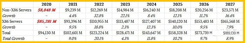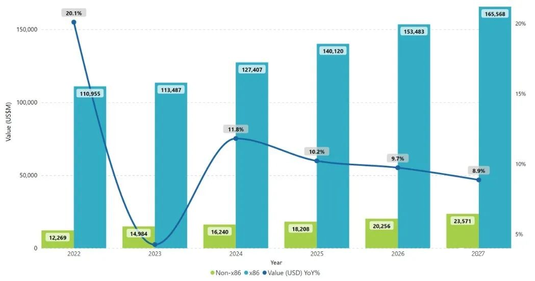 从整体的趋势来看,未来数年内,虽然非x86服务器保持了持续的高速增长,但是x86服务器仍然是整个服务器市场的主流,以销售计算的占比将持续维持在87.5%以上。即使到2027年,非x86服务器的市场份额仍然只有不到12.5%,相比2023年的11.66%,仅增长了1个百分点不到。