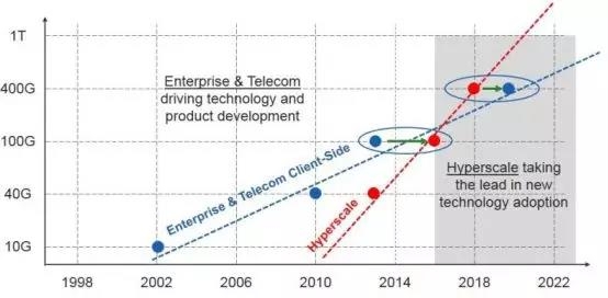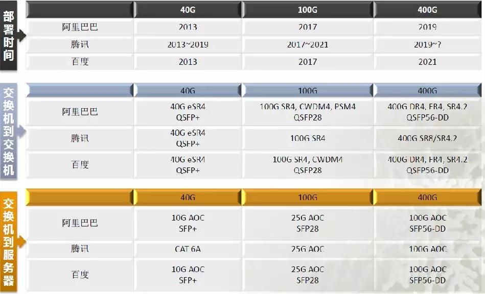 现阶段数据中心的100G方案已经成熟, 2019年400GbE初期部署将开启, 400GbE模块的攀升将从400G-DR4开始。谷歌2018年开始部署2*200GbE光收发器,腾讯也于2018年的三四月份开始了400G系统级测试。