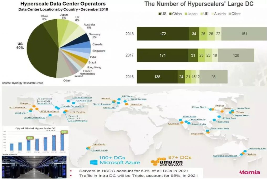 根据某调研机构的最新数据显示,超大规模供应商运营的大型数据中心数量在2018年增长了11%, 到年底达到430家。2018年亚太地区和欧洲、中东和非洲地区在数据中心方面占据最突出的位置,但是美国仍占据主要云和互联网数据中心的40%。