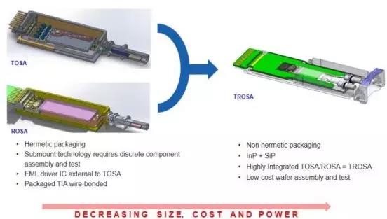 现阶段人们还无法使用单一激光器降低成本,只能依靠优化无源器件的价格来提升竞争力。实现最低的成本,能够高效地大批量生产的能力——这推动了收发器组件设计的创新,重点是利用集成、自动化、晶圆级生产和气密性封装的优势。这种创新在接收光子学组件(ROSA)和发射光子学组件(TOSA)中是显而易见的,比如易飞扬(Gigalight)的Mini TOSA正是行业领先的设计体现。
