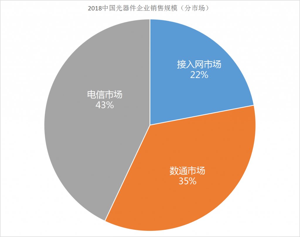 从图表分析得知,在光器件市场中,电信市场份额占比国内光器件企业很大销售额,说明电信市场的需求取决于电信运营商的资本开支,2019年将是5G元年,除了日韩等地开始商用5G网络,中国三大运营商已经在18个城市部署商用试点,将在下半年带来电信市场新一轮的规模需求增长。相关数据显示,2019年全球5G初期部署将建设50--60万基站,并带来330万只的光模块需求。
