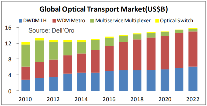 未来五年,光传输设备市场规模将达770亿美元,其中WDM系统占比超过90%。在5G移动和下一代固网宽带(G.fast、10GPON和DOCSIS3.1)的部署驱动下,城域接入和汇聚对WDM系统的需求增长最快。在WDM系统中,DCI占比逐渐上升,从2018年的12%上升到2022年的18%。