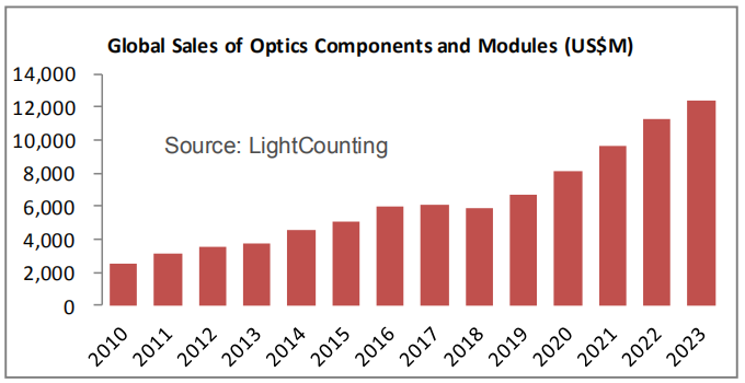 当前各预测机构都认为经过2018年的中美贸易战之后,电信行业会迎来触底反弹的机会。尤其是到了今年,国内5G部署开始拉开序幕的情况下,诸如5G前传的应用场景将拉动10G/25G波分复用光模块的需求增长,再加上DWDM系统的维护升级以及过去一年中WSS、EDFA、泵浦激光器、无源器件等不错的销售表现,电信市场在今后的几年将迎来有利于各器件商发展的行业机会。