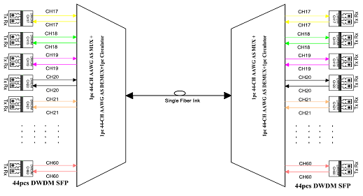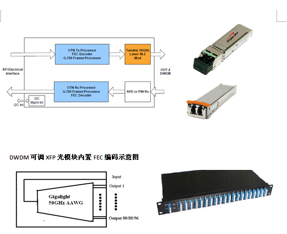 下图是易飞扬可调光模块(SFP+/XFP)和 50GHz DWDW 1U机箱设备组合方案示意图,供大家参考。