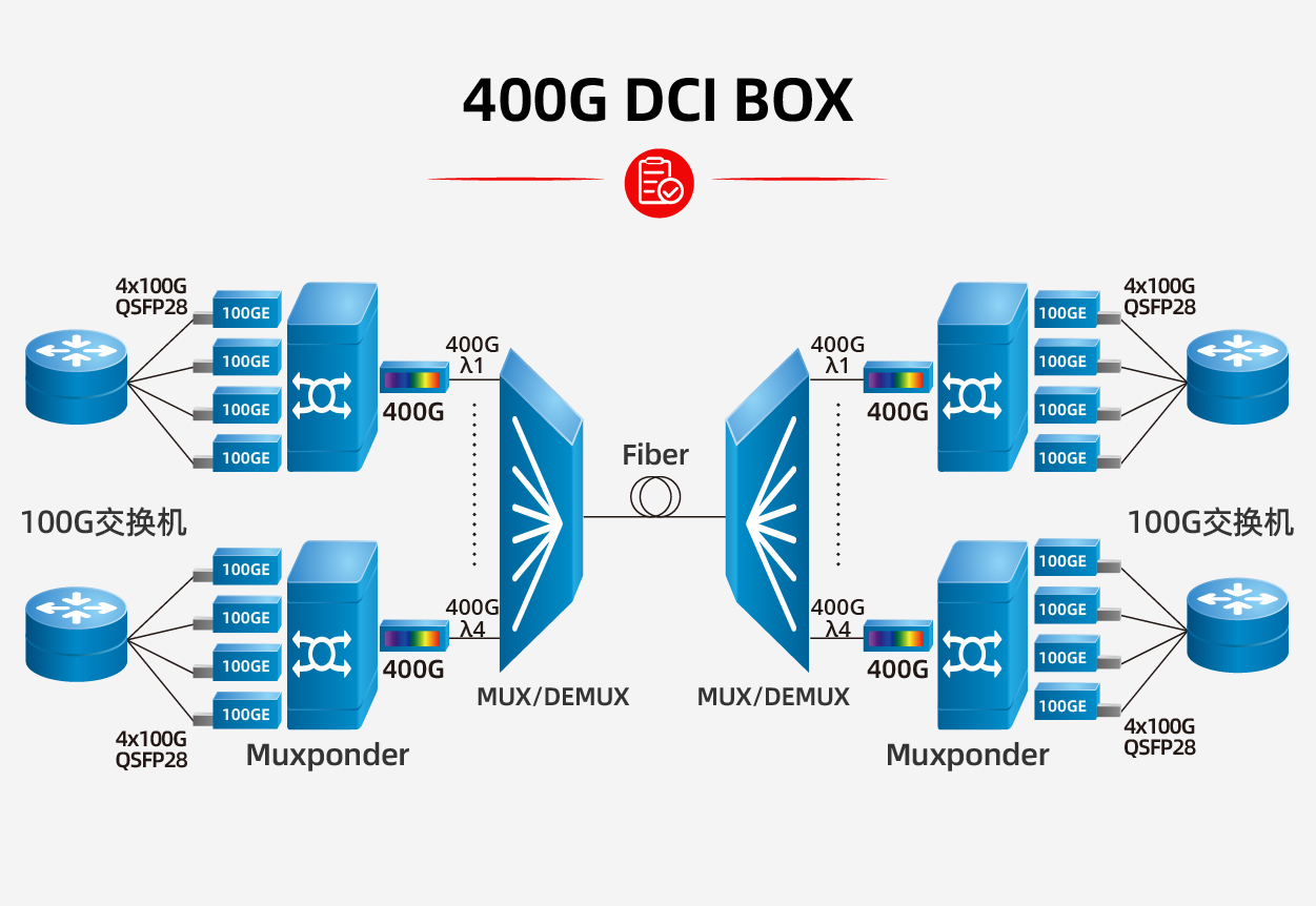 - 400G QSFP-DD Muxponder支持4路100G业务透传,可将4路100G业务信号转换为1路单波长400G相干光信号