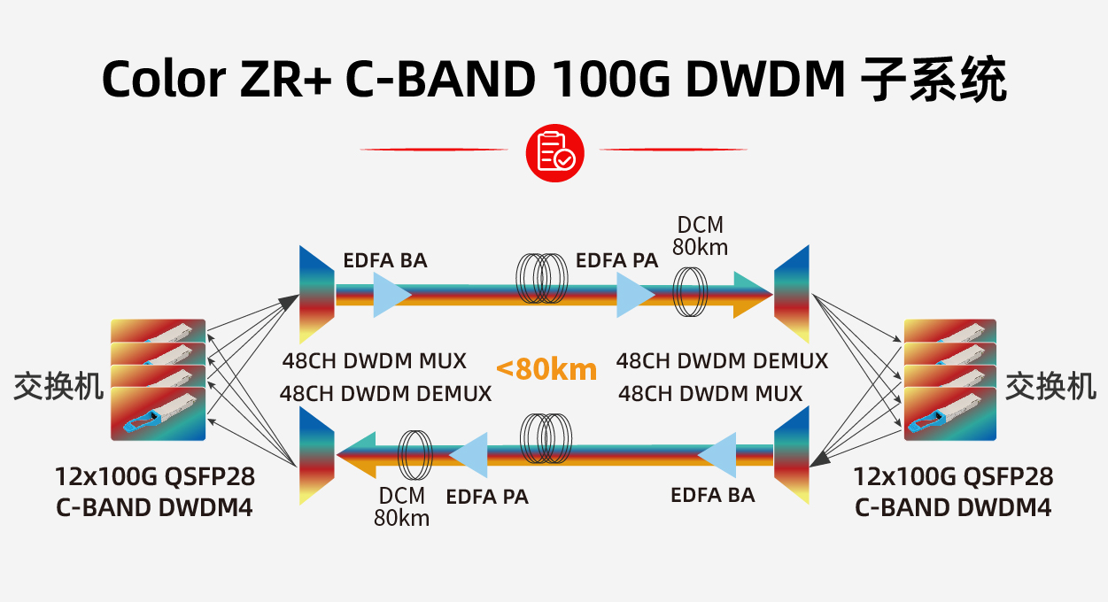 易飞扬(GIGALIGHT)的四载波Color ZR+ C-BAND 100G QSFP28 PSM DWDM4光模块光口侧采用MPO-12接口,配合外置波分复用/解复用器,在DCM色散补偿和EDFA的放大下,可以满足至少80km传输距离要求。光模块总功耗小于5W,组网总带宽双纤传输条件下满足1200G,单纤条件下满足400G。该产品可以直接插入100G QSFP28交换机端口,免除传统的DWDM波分电层设备。同时易飞扬可提供一站式解决方案,配套的自研的智能1U光层设备,包含DWDM EDFA、 AAWG和可调TDM或固定DCM,可为客户提供整套非相干DWDM传输解决方案,完成业务快速部署。